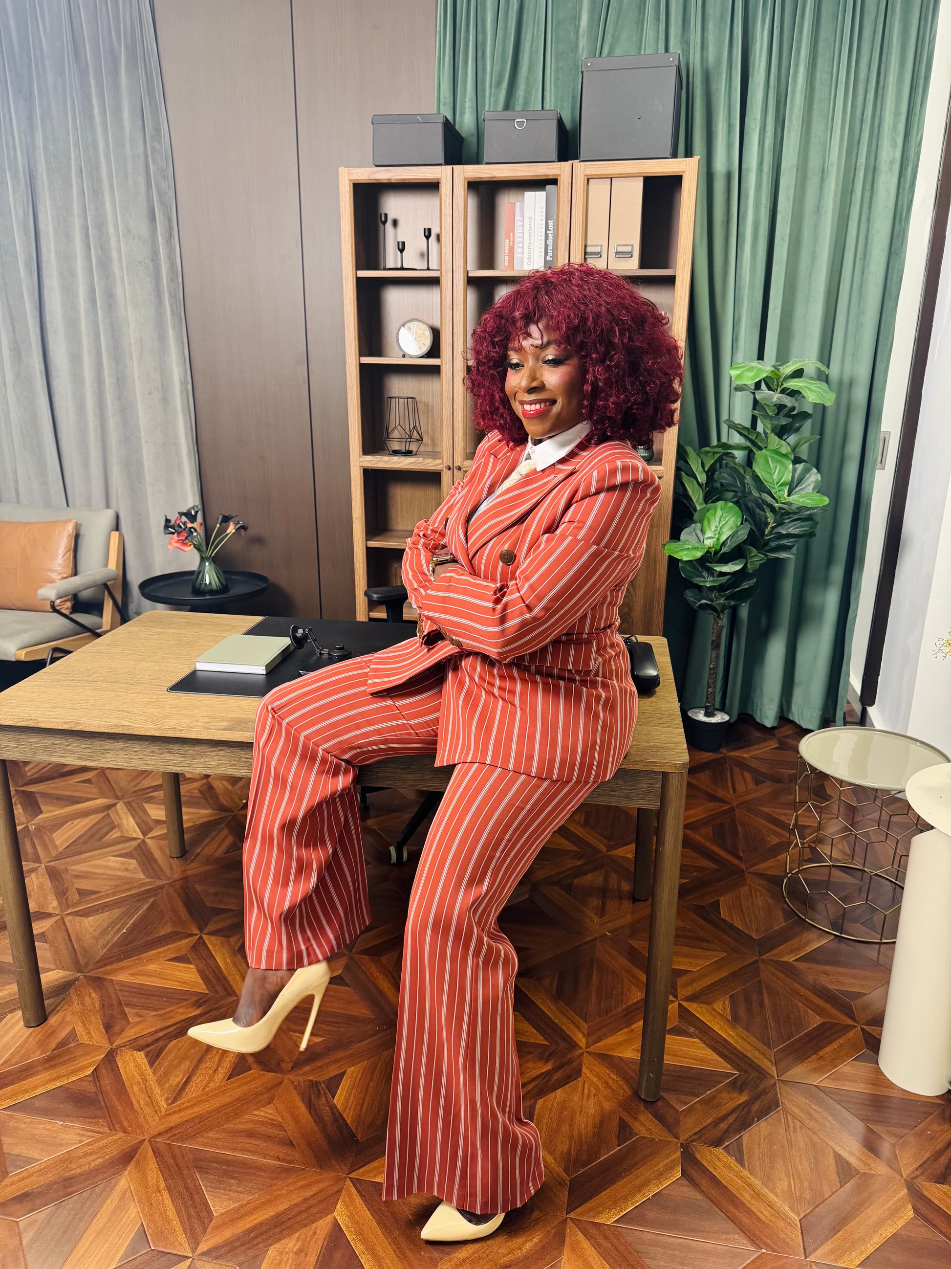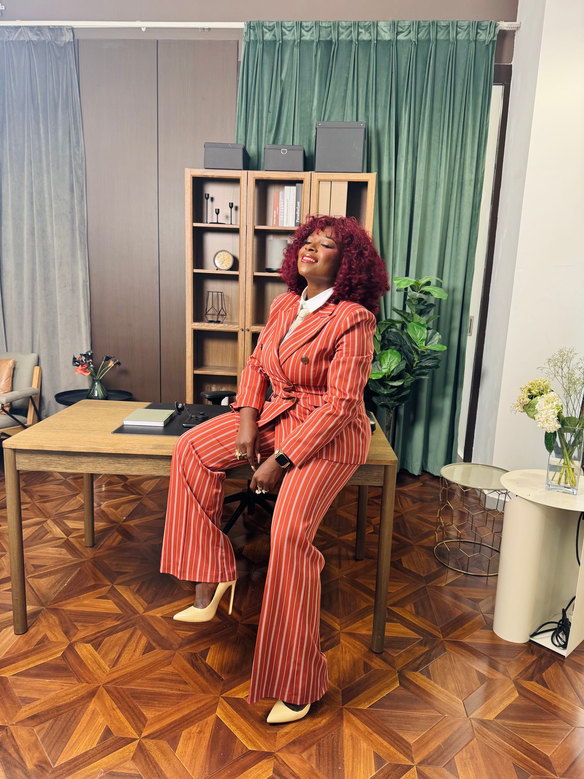 A refined, tailored suit designed for the modern woman who owns her space. This set features elongated pinstripes that visually lengthen the silhouette, a structured blazer that cinches at the waist for a flattering shape, and wide-leg trousers that move with confidence. Made with premium fabric for comfort, posture, and all-day polish, it’s the perfect blend of authority and elegance—ideal for boardrooms, events, and elevated everyday style.