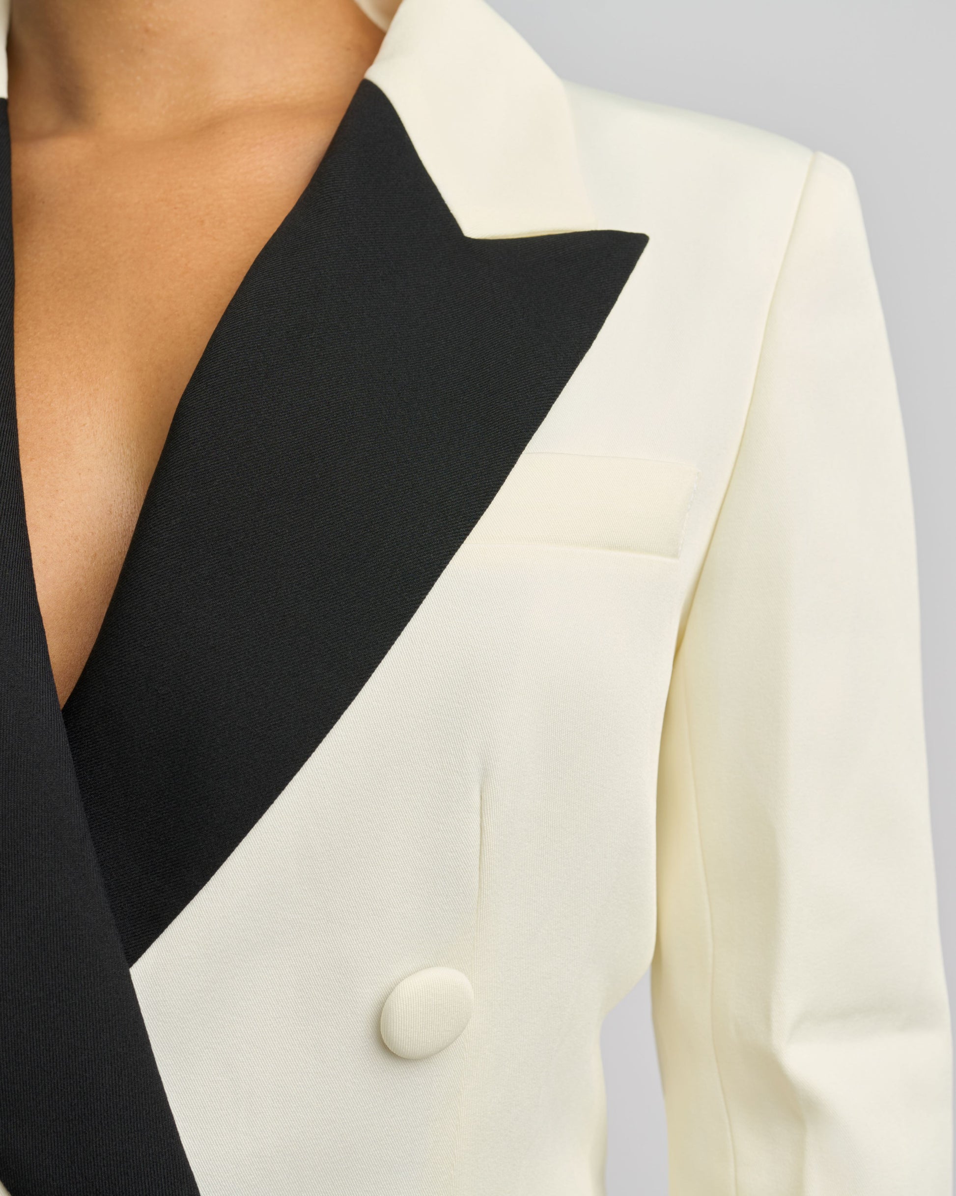 Power dressing has never looked this sleek. The Luxe Tux Blazer redefines sophistication with its bold, tailored silhouette and timeless monochrome palette. Featuring a sharp contrast lapel in black against a creamy ivory base, this double-breasted blazer effortlessly blends masculine edge with feminine elegance. The structured design, statement buttons, and subtle sheen make it a standout piece for elevated daywear or striking evening looks.