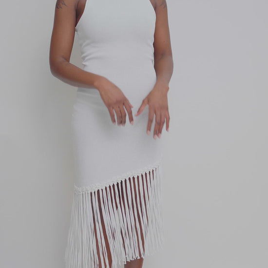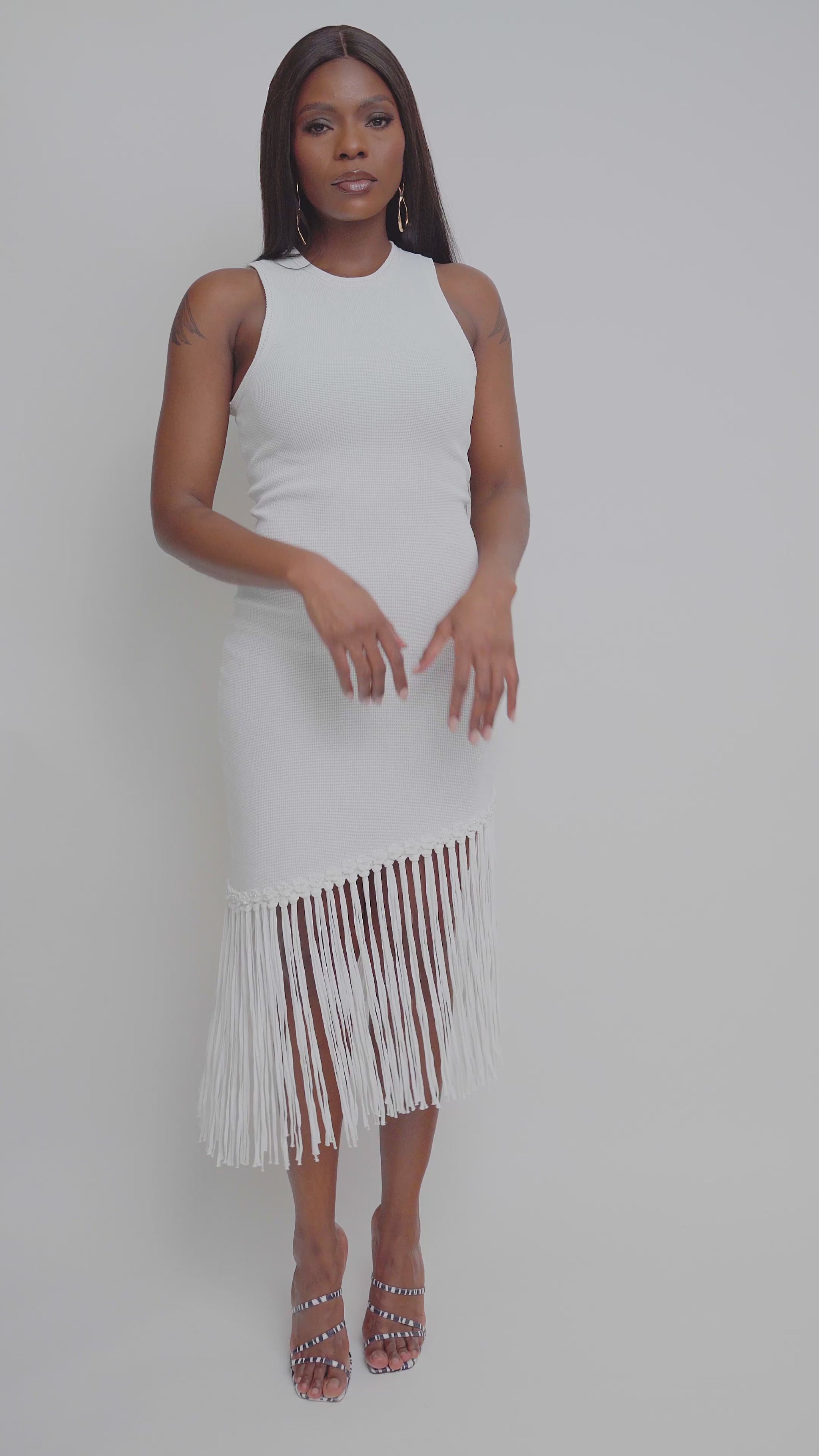 Make an entrance in The Riviera Fringe Dress, a timeless yet playful statement piece. Crafted from soft, stretchy ribbed fabric, this sleeveless bodycon silhouette hugs your curves beautifully. The high neckline adds sophistication, while the asymmetrical fringe hemline brings movement and flair to every step. Whether you’re headed to a summer soirée or a night out, this dress effortlessly blends elegance and edge.